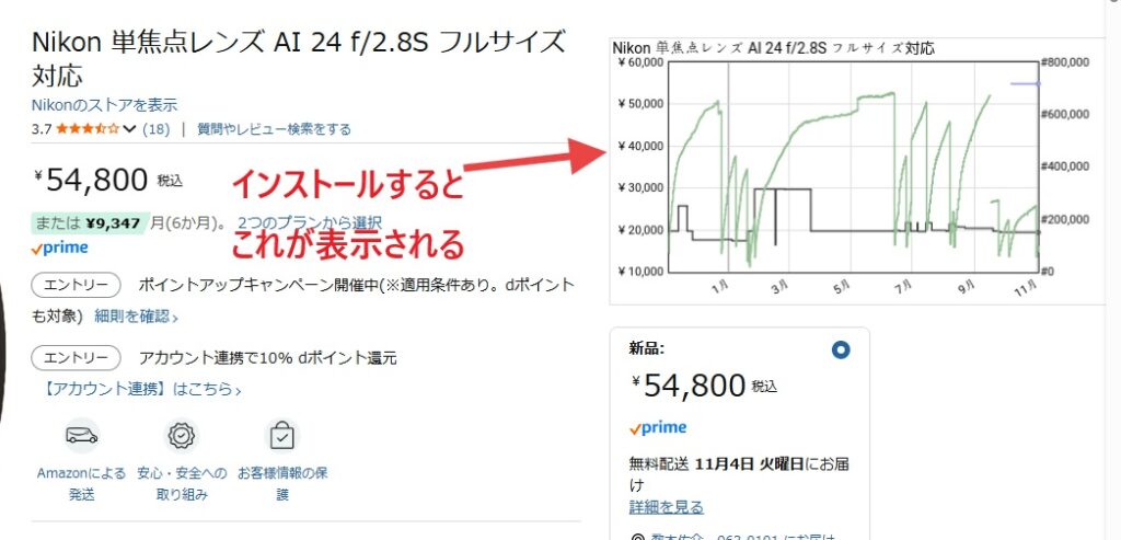 - 商品ページの右側上部、または一覧の商品に、keepaの価格推移ミニグラフが自動で表示されます。