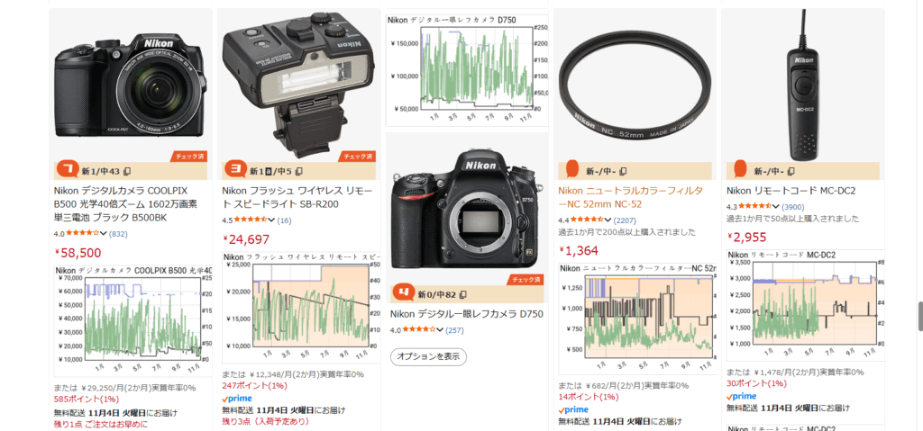 - 直感的に傾向を掴める:新品・中古・ランキングが一本のグラフにまとめられており、「価格が下がっている/ランキングが落ちている」などのサインをすぐに視認可能。